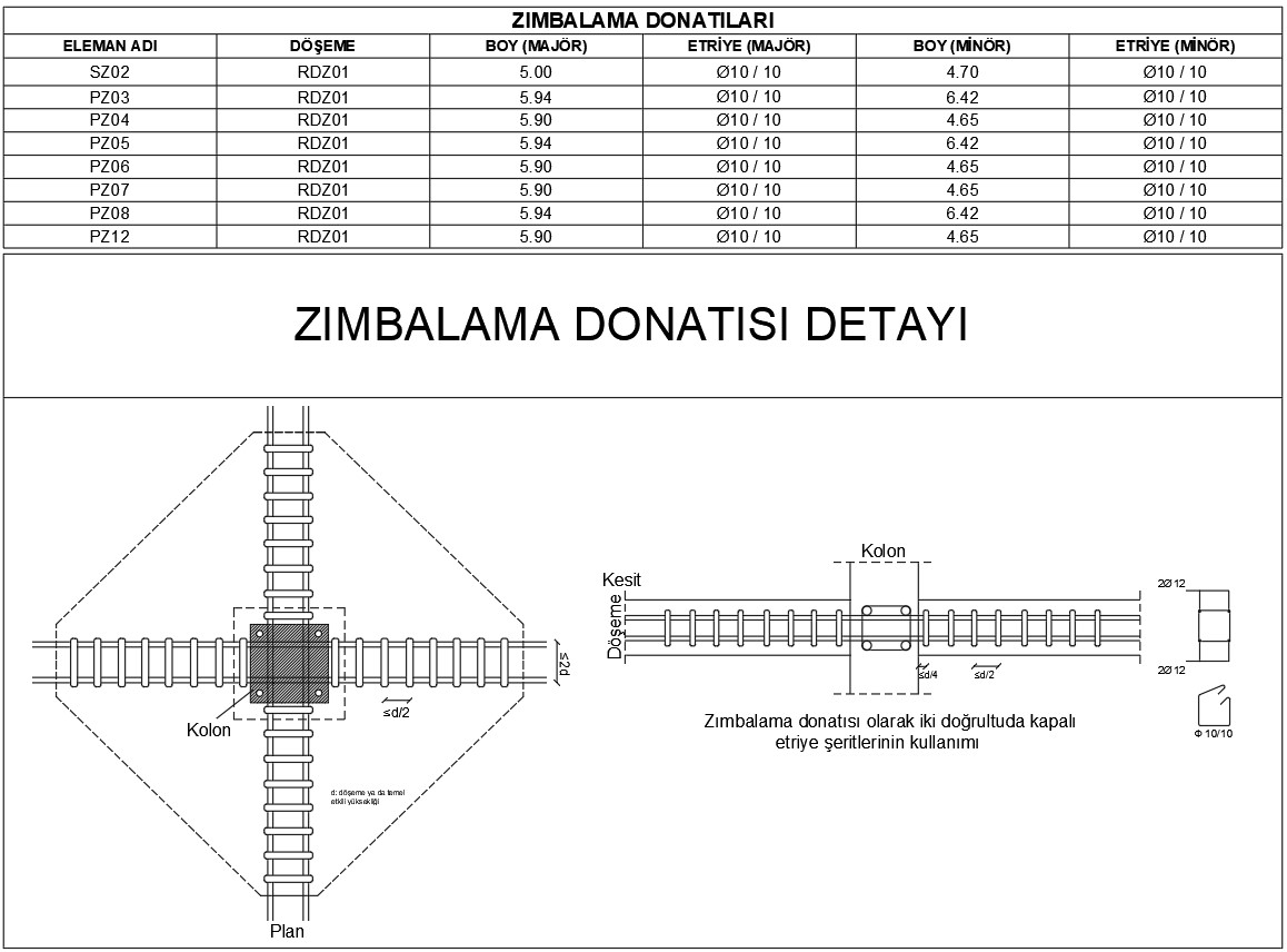 ideCAD v10.94 versiyonu itibari ile henüz zımbalama donatıları için otomatik çizim olanağı sağlamamaktadır. Dolayısıyla projelerinize zımbalama donatısı detayı eklemek için ideCAD ya da AutoCAD’in iki boyutlu çizim olanaklarından faydalanabilirsiniz. Bu linkten sizin için hazırladığım zımbalama donatısı detayını dwg formatında indirebilirsiniz. ideCAD otomatik çizim olanağı sağlamamasına karşın statik raporlarda zımbalama donatısı bilgilerini vermektedir. Bu rapordan elde edilen bilgileri verdiğim detay çizimlerindeki tabloya işlemeniz gerekmektedir.